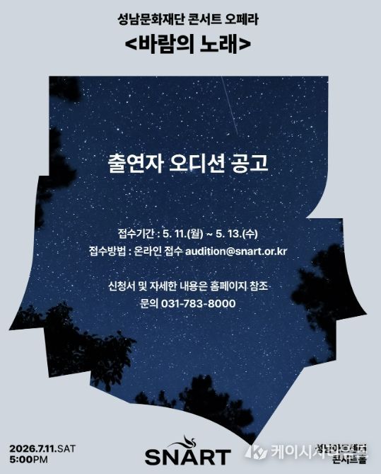 (케이시사타임즈) 성남문화재단은 콘서트 오페라 ‘바람의 노래’ 무대를 빛낼 주역 성악가를 선발하는 오디션을 개최한다.