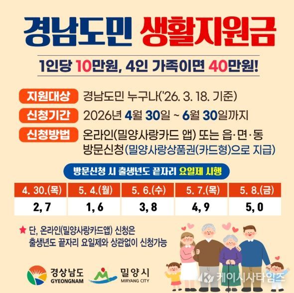 (케이시사타임즈) 경남 밀양시는 오는 4월 30일부터 시민 생활 안정을 지원하기 위한 ‘경남도민 생활지원금’ 신청을 받는다고 밝혔다.