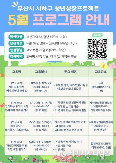 (케이시사타임즈) 부산 사하구는 구직 활동에 지친 청년들의 일상 회복과 취업 역량 강화를 위해 '2026년 청년성장 프로젝트' 5월 프로그램 참여자를 선착순 모집한다.