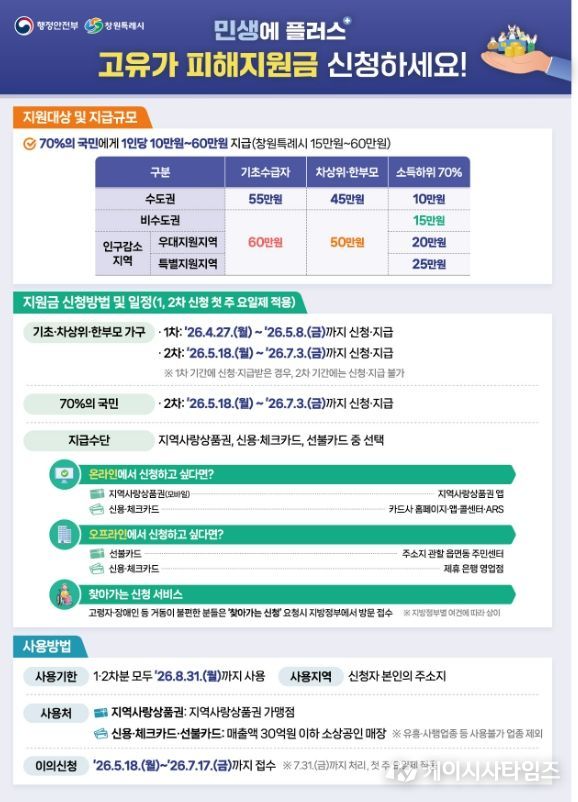 (케이시사타임즈) 고유가·고물가로 가중된 민생 부담을 덜기 위해 전국적으로 시행되는 ‘고유가 피해지원금’ 신청 첫날인 27일, 창원특례시 내 55개 읍면동 접수 창구에는 시민들의 지원금 신청 발길이 온종일 이어졌다.
