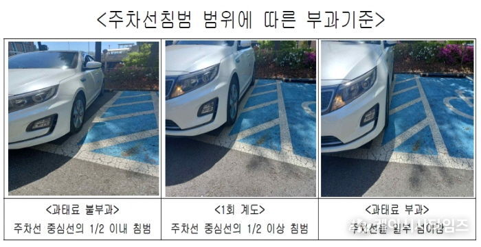 시에 따르면, 차량이 주차선 중심선을 기준으로 절반 이하만 침범한 경우에는 일부가 선에 걸쳐 있더라도 과태료를 부과하지 않는다. 그러나, 중심선을 기준으로 절반 이상 넘어간 경우에는 주차선 침범으로 간주하며, 최초 1회에 한해 계도 조치가 이루어진다. 다만, 차량이 주차구획선을 명확히 넘어 장애인전용주차구역 안으로 일부라도 침범한 경우에는 관련 법령에 따라 10만 원의 과태료를 부과한다.