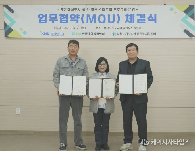 (케이시사타임즈) 삼척도계도시재생현장지원센터는 4월 23일 센터에서 강원대학교 도계운영본부, 사단법인 한국대학발명협회와 함께 ‘도계대학도시 청년·광부 스타트업 프로그램 운영’을 위한 업무협약(MOU)을 체결했다.