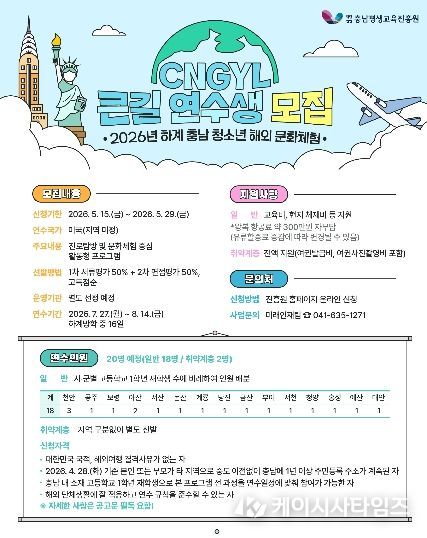 (케이시사타임즈) (재)충남평생교육진흥원은 도내 청소년들이 미국 현지에서 다양한 문화를 체험하고 자신의 진로를 탐색할 수 있도록'2026년 충남 청소년 해외 문화체험 큰길(CNGYL) 프로그램'하계 연수생을 모집한다.