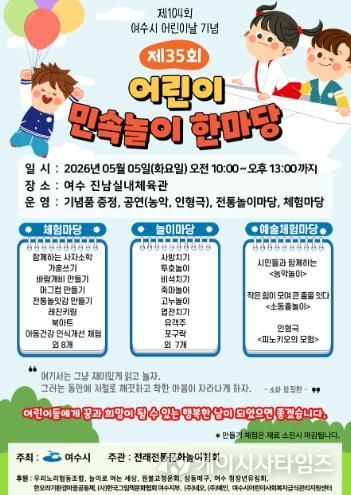 (케이시사타임즈) 여수시는 제104회 어린이날을 맞아 5월 5일, 아이들이 가족과 함께 전통문화를 즐기며 마음껏 뛰놀 수 있는 민속놀이 놀이 한마당을 개최한다.