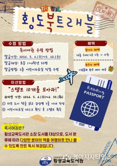 (케이시사타임즈) 횡성교육도서관은 5월 6일부터 6월 30일까지 어린이들의 자발적인 독서 습관 형성과 도서관 이용 활성화를 위해 독서 여권을 활용한 ‘횡도북트래블’ 프로그램을 운영한다고 밝혔다.