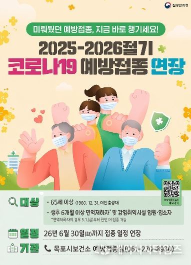 (케이시사타임즈) 목포시는 2025~2026절기 코로나19 예방접종사업 기간을 오는 5월 1일부터 6월 30일까지 2개월간 연장 운영한다고 밝혔다.