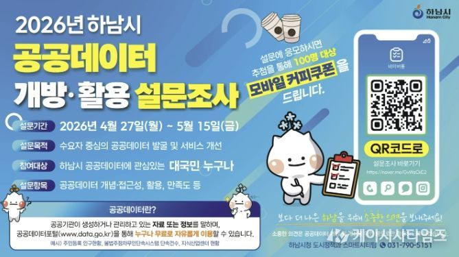 (케이시사타임즈) 하남시는 시민과 기업, 연구기관 등 다양한 수요자의 의견을 반영해 공공데이터 개방 및 활용을 확대하고자 ‘2026년 하남시 공공데이터 설문조사’를 실시한다고 밝혔다.