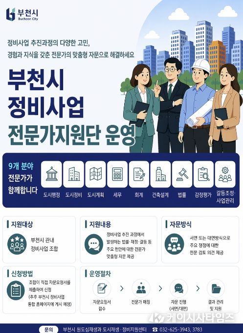 (케이시사타임즈) 부천시는 정비사업 추진 과정에서 발생하는 법률·재정·갈등 등 주요 현안에 대한 전문 자문을 지원하기 위해 ‘정비사업 전문가지원단’을 구성해 운영한다고 지난 28일 밝혔다.