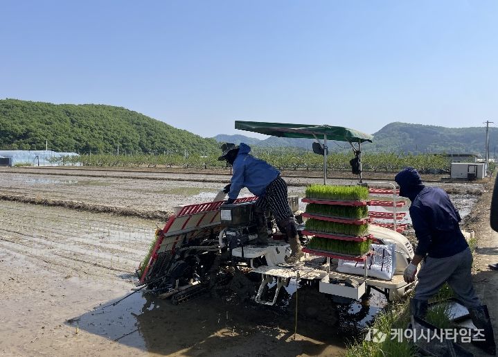 (케이시사타임즈) 경산시 자인면 울옥리 신호철 농가는 27일 자인면 원당들 일원 6ha에 올해 첫 모내기를 실시했다.