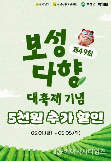 (케이시사타임즈) 보성군은 제49회 보성다향대축제를 맞아 5월 1일부터 5일간 공공배달앱 ‘먹깨비’를 활용한 추가 할인 행사를 진행한다고 밝혔다.