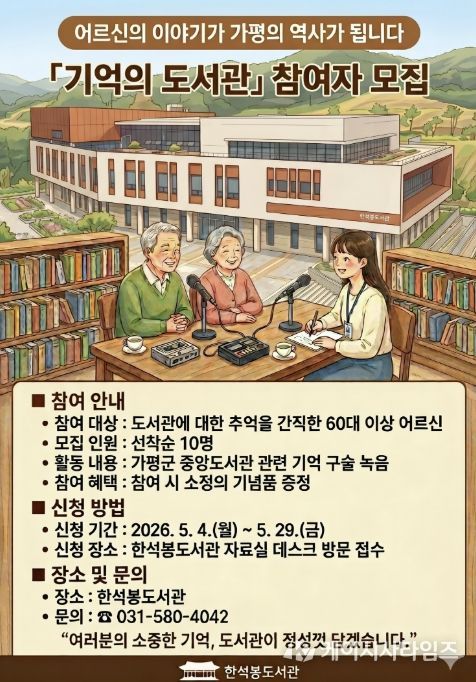 (케이시사타임즈) 가평군 한석봉도서관이 오는 5월부터 어르신들의 생생한 목소리로 지역의 옛 기록을 수집하는 ‘기억의 도서관’ 프로그램을 운영한다. 실버층 특화 사업인 ‘말랑말랑 추억 교실’의 일환으로 추진되는 이번 사업은 지역 문화 자산을 확보하고 세대 간 기억을 공유하고자 기획됐다.