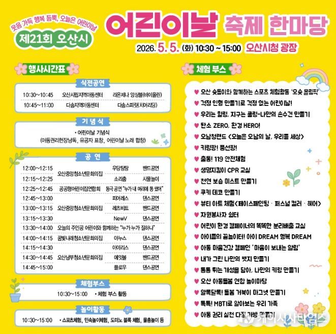 (케이시사타임즈) 오산시는 오는 5월 5일 어린이날을 맞아 오산시청 광장에서 ‘제21회 오산시 어린이날 축제 한마당’을 개최한다고 밝혔다.