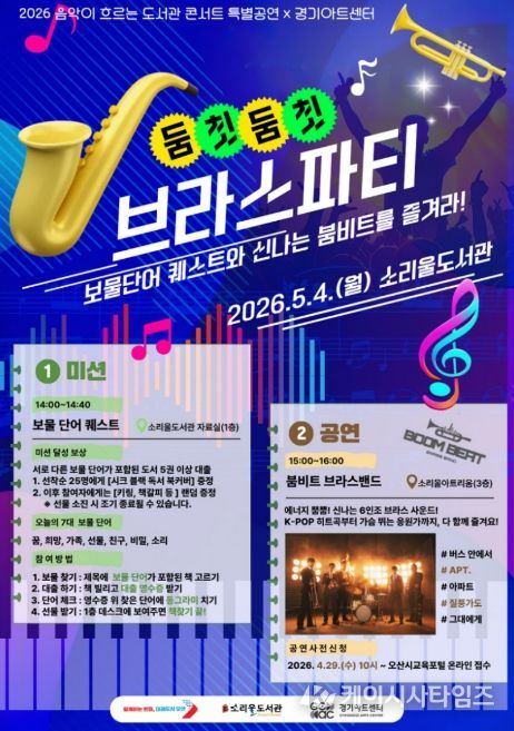 (케이시사타임즈) 오산시 소리울도서관은 제104회 어린이날을 앞둔 오는 5월 4일 경기아트센터와 협업해 ‘2026 음악이 흐르는 도서관 콘서트’ 특별공연인 ‘둠칫둠칫 브라스 파티’를 개최한다고 밝혔다.