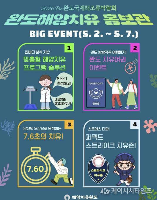 (케이시사타임즈) ‘2026 Pre 완도국제해조류박람회’ 개최 기간(5.2~5.7) 동안 완도만의 해양치유 콘텐츠를 선보이는 ‘해양치유 홍보관’을 운영한다.