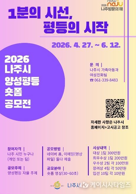 (케이시사타임즈) 전남 나주시가 양성평등 문화 확산을 위해 시민이 직접 참여하는 숏폼 영상 공모전을 개최하고 일상 속 평등 가치 확산에 나선다.