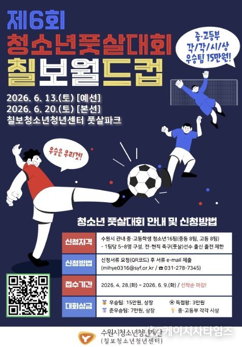 칠보청소년청년센터 관계자는 “청소년들이 학업 스트레스에서 벗어나 그라운드에서 마음껏 기량을 펼치며 건강한 에너지를 발산하기를 바란다”며, “안전한 대회 운영을 위해 최선을 다해 준비하고 있으니 수원시 청소년들의 많은 관심과 참여를 기대한다”고 전했다.