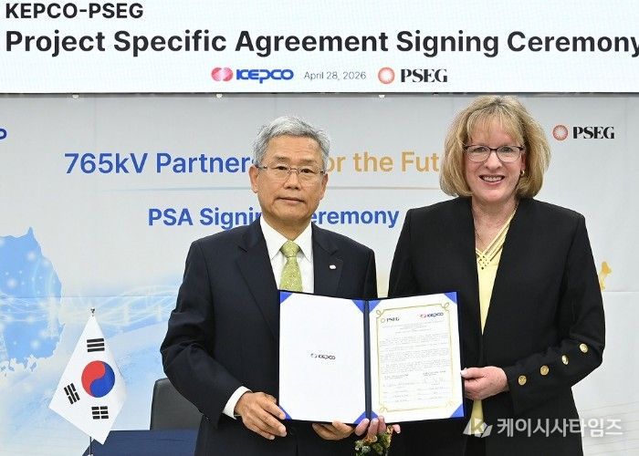 (케이시사타임즈) 한국전력이 4월 28일 서울 양재동 한전 아트센터에서 미국 에너지기업 PSEG社와 765kV 초고압 송전망 사업 협력을 위한 계약을 체결했다.