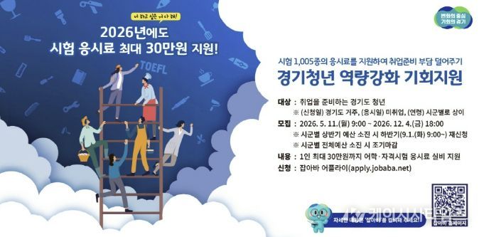 이 사업은 2025년 12월 1일~2026년 11월 30일 응시한 시험에 대해 1인당 최대 30만 원까지 응시료를 지원하며, 동일 시험의 경우 최대 3회까지 지원한다.