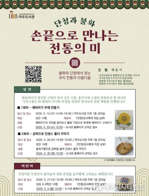 (케이시사타임즈) 고양특례시 마두도서관은 오는 5월, 단청과 불화를 주제로 우리 전통의 아름다움을 체험할 수 있는 프로그램 ‘손끝으로 만나는 전통의 미’를 운영한다.