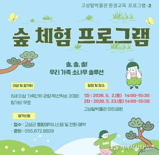 (케이시사타임즈) 고성탈박물관은 오는 5월 2일과 23일 오후 2시부터 가족 관람객 20명을 대상으로 숲 체험 프로그램을 운영한다.