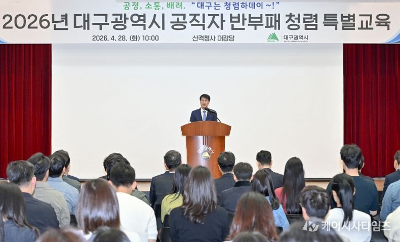 (케이시사타임즈) 대구광역시는 4월 28일 산격청사 대강당에서 김정기 대구시장 권한대행을 비롯한 고위공직자 및 신규·승진 공무원 등 200여 명이 참석한 가운데 ‘2026년 반부패·청렴 특별교육 및 청렴 결의대회’를 개최했다.