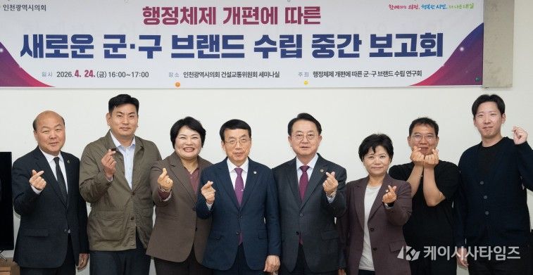 (케이시사타임즈) 인천광역시의회 ‘행정체제 개편에 따른 군·구 브랜드 수립 연구회(대표의원 허식)’는 최근 시의회 건설교통위원회 세미나실에서 새로운 군ㆍ구 브랜드 수립을 위한 연구용역 중간보고회를 개최했다고 28일 밝혔다.