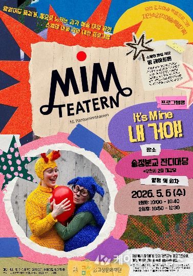 『내 거야! It’s Mine!』은 2인 배우가 출연하는 약 35분 분량의 어린이 마임 공연으로, 공감과 협동, 감정 이해를 몸짓과 놀이를 통해 풀어내는 작품이다. 자연 속 야외 공간에서 자유롭게 관람하는 방식으로 진행돼, 유아들이 보다 편안한 분위기 속에서 예술을 경험할 수 있도록 구성했다.
