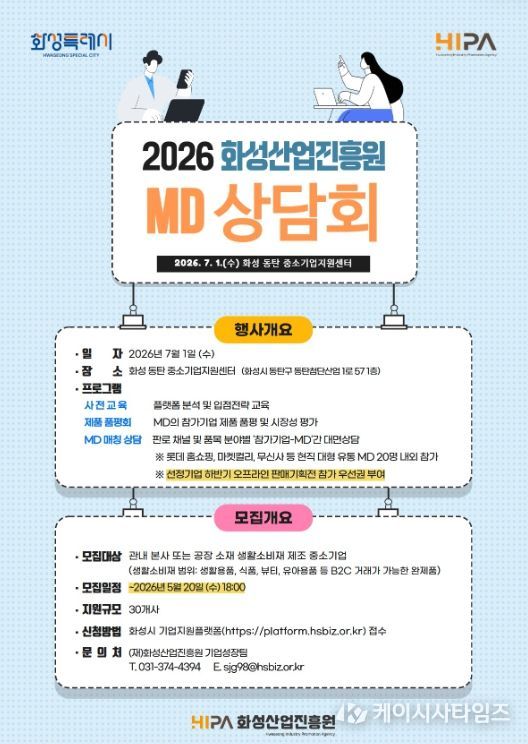 (케이시사타임즈) 화성산업진흥원(원장 전병선)은 화성시 생활소비재 기업의 대형 유통망 진입과 신규 판매채널 확보를 지원하기 위해 ‘2026년 화성산업진흥원 MD 상담회’를 개최하고, 오는 5월 20일까지 참여기업을 모집한다.