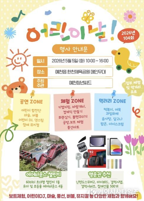 (케이시사타임즈) 예천군은 제104회 어린이날을 맞아 오는 5월 5일 오전 10시부터 오후 4시까지 한천체육공원 메인무대 일원에서 ‘2026년 제104회 예천군 어린이날 기념행사’를 개최한다.
