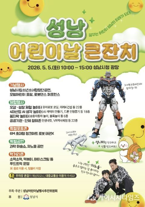 성남시 관계자는 “이번 어린이날 행사는 초대형 로봇 태권, 인공지능 로봇 타이탄 등 미래 기술을 직접 체험할 수 있는 대형 놀이터로 꾸며진다”면서 “87개의 다채로운 프로그램을 통해 온 가족이 특별한 하루를 보내길 바란다”고 말했다.