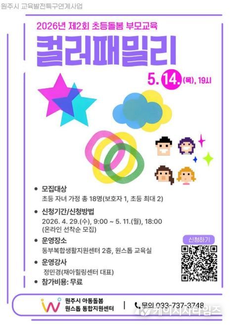(케이시사타임즈) 원주시 아동돌봄 원스톱통합지원센터는 다음 달 14일 오후 7시, 관내 초등학생 자녀와 보호자를 대상으로 가족 간의 이해와 소통을 돕는 부모교육 프로그램 ‘컬러패밀리’를 운영한다.