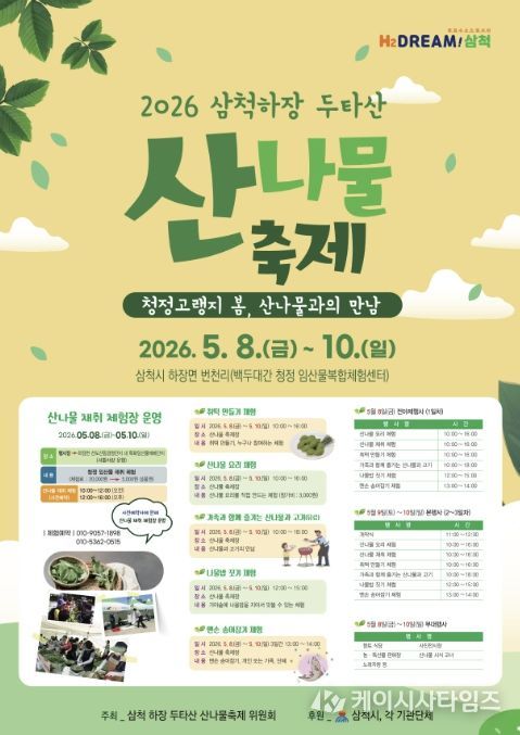 (케이시사타임즈) 삼척시는 2026년 제13회 ‘삼척 하장 두타산 산나물 축제’가 5월 8일부터 10일까지 백두대간 청정임산물 복합체험센터(삼척시 하장면 두타로 499) 일원에서 개최된다고 밝혔다.