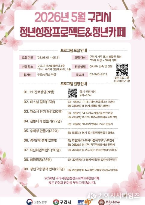 구리시 관계자는 “이번 5월 프로그램은 청년들이 자신을 발견하고, 내일을 설계하며, 지역 안에서 함께 성장할 수 있도록 준비한 자리”라며 “진로와 취업을 고민하는 청년은 물론, 새로운 경험과 교류를 원하는 청년들의 많은 관심과 참여를 바란다.”라고 말했다.