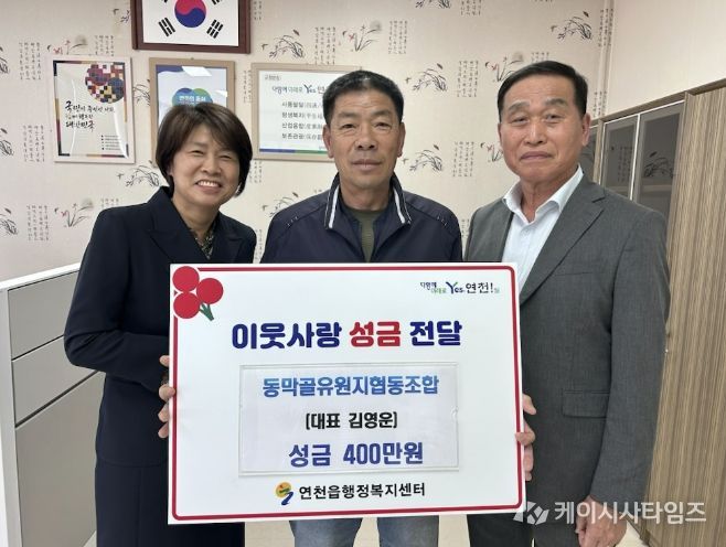(케이시사타임즈) 동막골유원지협동조합은 지난 28일 오후 4시 연천읍행정복지센터 읍장실에서 이웃돕기 후원 성금 400만 원을 기탁했다.