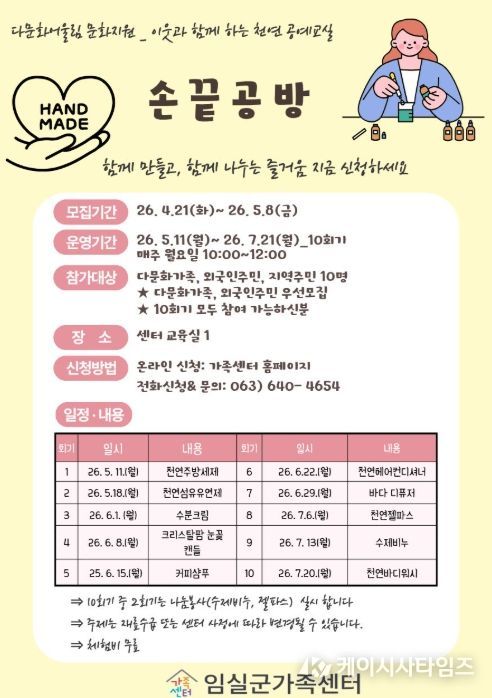 (케이시사타임즈) 임실군 가족센터는 다문화가족·외국인주민·지역주민이 함께 천연 생활용품을 만들고 나누며 이웃 간 따뜻한 소통과 어울림을 경험할 수 있는 천연공예 프로그램 '손끝공방' 참여자를 모집한다.