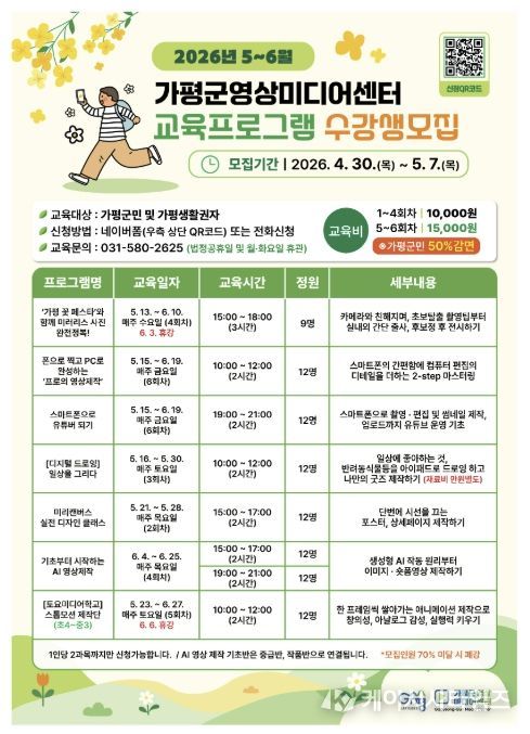 주요 프로그램은 총 7개 과정이다. △‘가평 꽃 페스타’와 함께 미러리스 사진 완전정복! △폰으로 찍고 PC로 완성하는 프로의 영상제작 △스마트폰으로 유튜버 되기 △[디지털 드로잉] 일상을 그리다 △미리캔버스 실전 디자인 클래스 △기초부터 시작하는 AI 영상제작(오후/야간) △[토요미디어학교] 스톱모션 제작단 등이다.