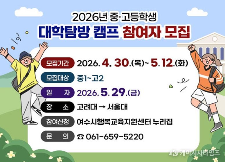(케이시사타임즈) 여수시는 오는 30일부터 관내 중학교 1학년부터 고등학교 2학년 학생들을 대상으로 ‘2026년 중·고등학생 대학 탐방 캠프’ 참여자를 모집한다.