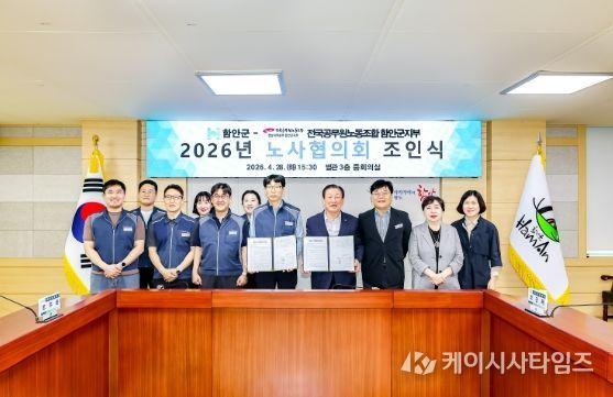 (케이시사타임즈) 함안군은 지난 28일 군청 3층 중회의실에서 전국공무원노동조합 함안군지부(지부장 조주환)와 공무원 권익 향상과 복지 증진을 위한 노사협의회 합의서에 최종 서명했다고 밝혔다.