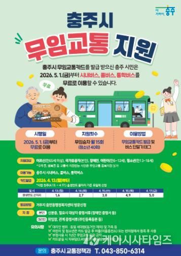 (케이시사타임즈) 충주시가 교통약자의 이동 편의를 높이고 사회활동 참여를 독려하기 위해 오는 5월 1일부터 ‘충주시 어르신 등 무임교통 지원 사업’을 전격 시행한다고 밝혔다.