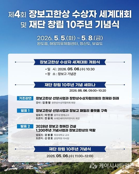 (케이시사타임즈) 사단법인 장보고글로벌재단(이사장 김덕룡)이 창립 10주년 기념식 및 제4회 장보고한상 수상자 세계대회를 5월 5일부터 8일까지 완도에서 개최한다고 밝혔다.