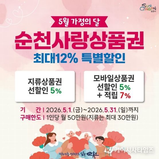(케이시사타임즈) 순천시가 5월 한 달간 순천사랑상품권 특별 할인행사를 추진해 시민들의 가계 부담을 덜고 지역 소상공인에게 활력을 불어넣는 소비 촉진에 나선다.
