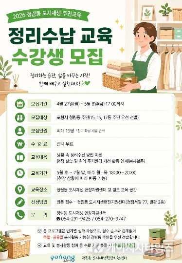(케이시사타임즈) 포항시 도시재생과는 청림동의 주거 환경을 개선하고 주민 스스로 마을을 돌볼 수 있는 자생력을 키우기 위해 ‘2026 청림동 도시재생 주민교육 : 정리수납 교육 및 집수리 교육’ 참여 주민을 모집한다.