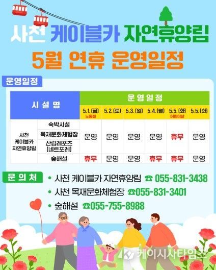 (케이시사타임즈) 사천시는 5월 가정의 달과 어린이날을 포함한 연휴 기간을 맞아 사천케이블카 자연휴양림의 이용객 편의를 위한 시설별 5월 연휴 운영 계획을 안내했다.