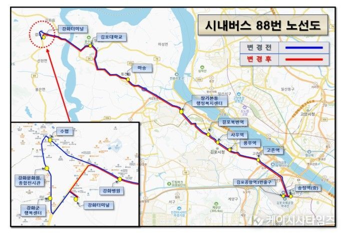 (케이시사타임즈) 김포시가 5월 1일부터 시내버스 88번 노선의 강화군 구간을 변경 운행한다고 밝혔다.