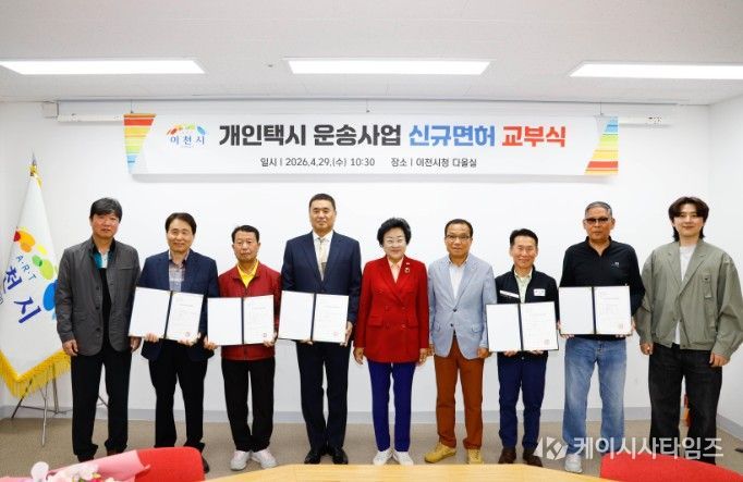 (케이시사타임즈) 이천시는 29일 시청 다올실에서 개인택시운송사업 신규 면허증 교부식을 개최하고, 심사를 통해 최종 선정된 5명의 대상자에게 면허증을 전달했다고 밝혔다.