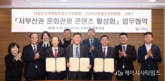 (케이시사타임즈) 부산 사하구는 서부산권에서 개최되는 축제 및 문화 행사를 중심으로 지역 문화관광 콘텐츠의 발전 가능성을 함께 모색하고 지속가능한 협력 기반을 마련하기 위해 4월 29일 다대포선셋영화축제조직위원회, 부산축제조직위원회와 업무협약을 체결했다고 밝혔다.