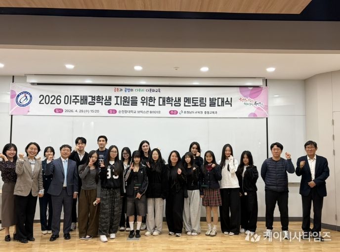 (케이시사타임즈) 충남교육청은 29일, 순천향대학교(아산)에서 순천향대 지도자 학생 6명과 온양용화고·아산충무고 학생 20명, 담당 교사 등 30여 명이 참석한 가운데 ‘2026 이주배경학생 지원을 위한 대학생 지도 발대식’을 개최했다.