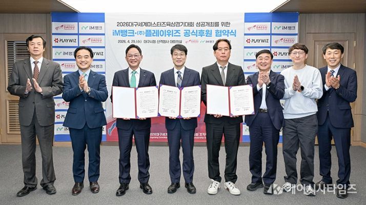 (케이시사타임즈) 2026대구세계마스터즈육상경기대회 조직위원회는 4월 29일 시청 산격청사에서 iM뱅크 및 ㈜플레이위즈와 대회 공식 후원협약을 체결했다.