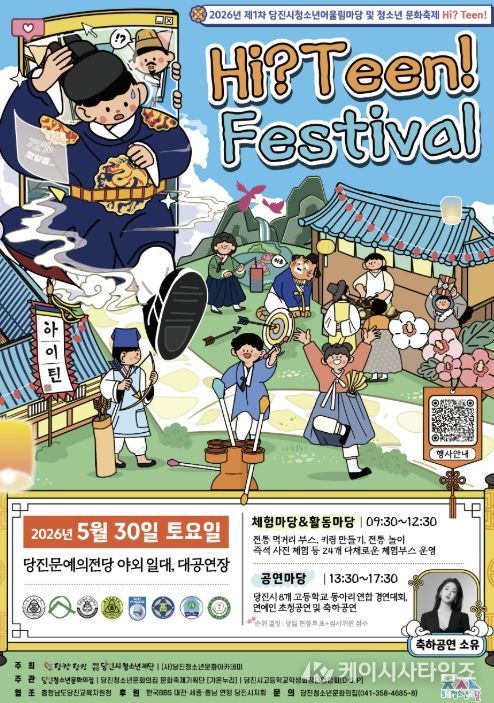 (케이시사타임즈) 5월 30일 토요일, 당진문예의전당에서 2026년 제1차 당진시청소년어울림마당 및 청소년 문화축제 [Hi? Teen!]이 개최된다. 이번 행사는 ‘전통’을 중심으로 영화 ‘왕과 사는 남자’를 모티브로 기획됐으며, 현대와 조선을 넘나드는 색다른 분위기 속에서 청소년이 직접 기획·운영하는 참여형 축제로 마련됐다.