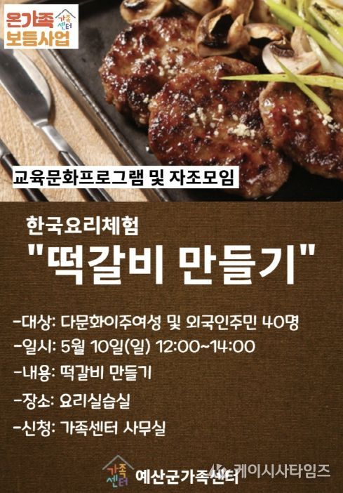 (케이시사타임즈) 예산군가족센터는 지역 내 결혼이주여성과 외국인 주민의 한국문화 이해 증진과 안정적인 정착 지원을 위해 오는 5월 10일 한국전통요리 체험 ‘떡갈비 만들기’ 프로그램을 운영한다고 밝혔다.